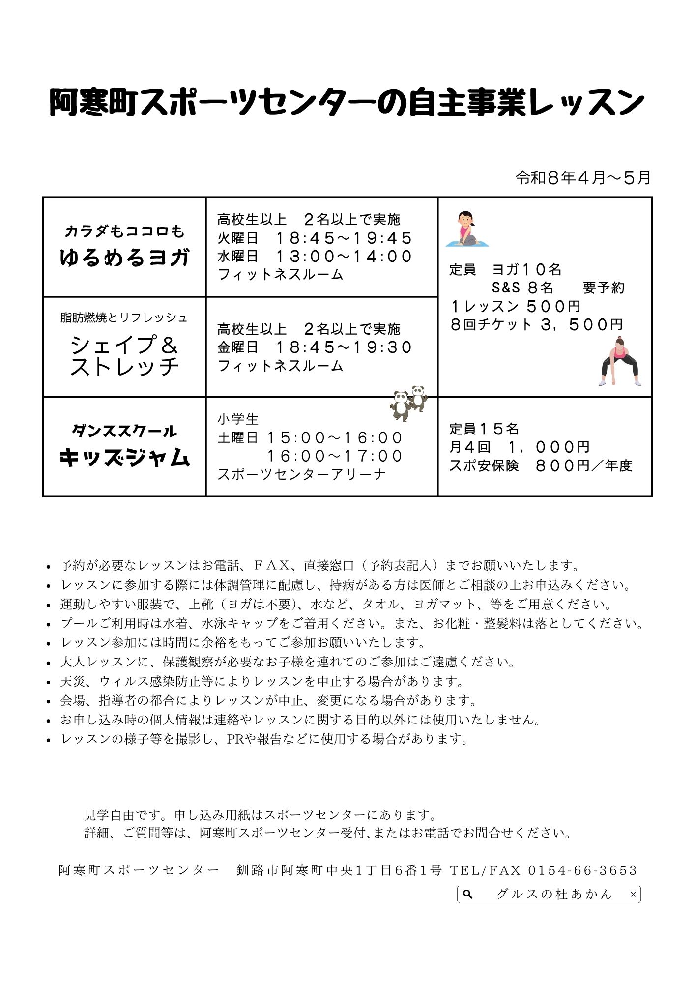 阿寒町スポーツセンターでは、新年度の自主事業レッスンを下記のとおり実施いたします。